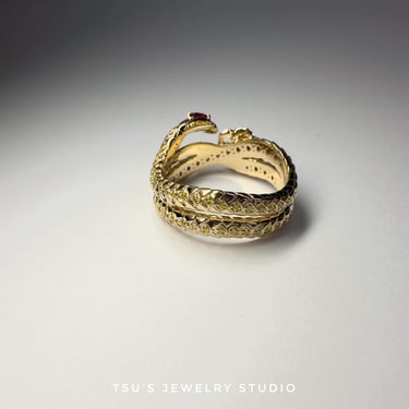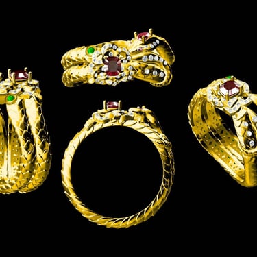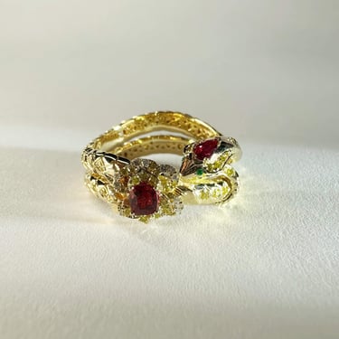 Stones, such as in the snake’s eyes, are precisely set to complement the design, enhancing the piece without overshadowing its intricate craftsmanship.